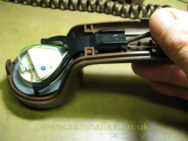 The handset is held together by the single screw at the earpiece end - the only other screw in the entire telephone - and two pegs at the cord end. The mouldings snap together along all edges. By applying a little leverage at the cord end the two sections can be pulled apart.