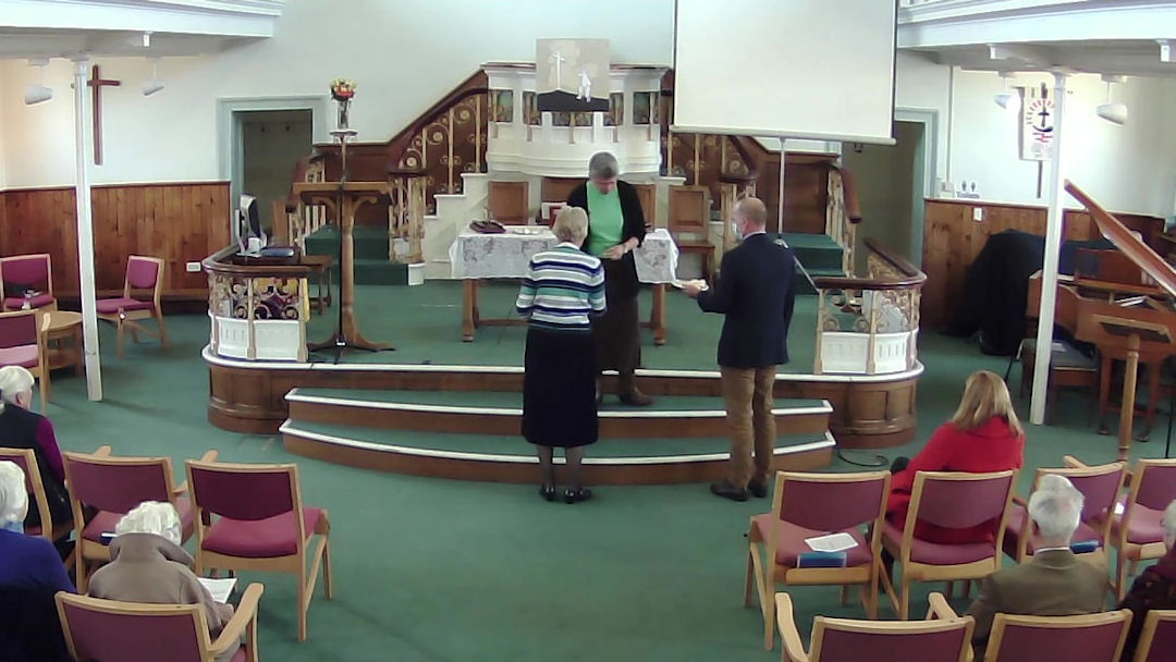 The opening view from the mobile phone is slightly fuzzy and sometimes a litle jerky, probably caused by low bandwidth on the Wifi link. The end section is clear enough but the slight loss of lip synchronisation is an artefact of the recording process. There was a problem with the Wifi link to the mobile phone at the end of the service as the image had frozen.