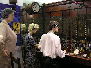 The exchange test desk with the technician in familiar brown dust coat. Some nice authentic touches here - the enamel lamp shades and waste paper bin. |