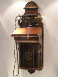 Next are some early telephone instruments that I haven't photographed before. This telephone dated 1879-80 uses a Blake transmitter. The bell on top looks something of an afterthought. |