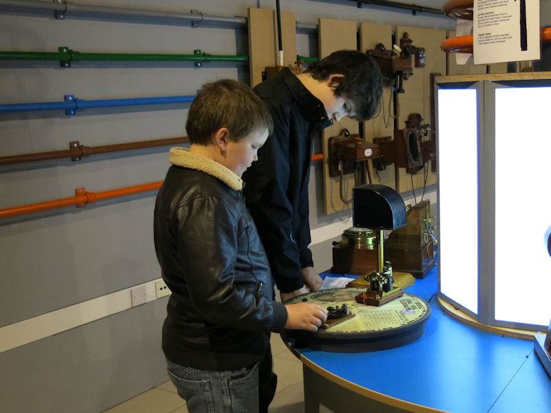 There's more telegraph equipment. Here a visitor tries his hand at sending Morse code. In the background is the Wheatstone ABC telegraph which can be worked by visitors. |